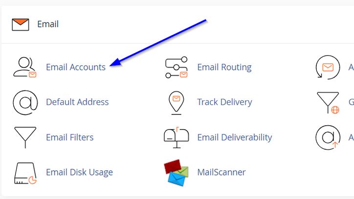 پس از ورود به سی پنل، در بخش Email روی گزینه Email Accounts کلیک کنید. در این قسمت میتوانید لیست ایمیلهای ساختهشده قبلی را مشاهده کنید.
