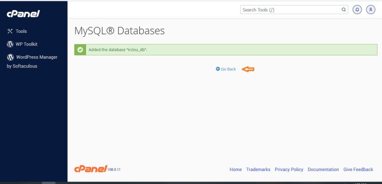 5.پس از ایجاد موفق پایگاه داده، پیام تأیید نمایش داده می‌شود. روی گزینه Go Back کلیک کنید.