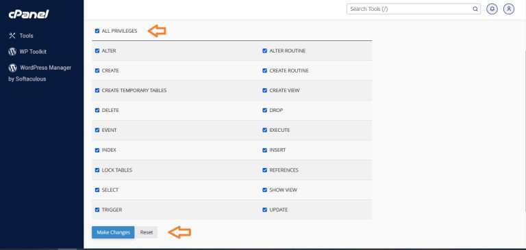 4.در صفحه باز شده، گزینه ALL PRIVILEGES را فعال کنید تا تمام دسترسی‌ها داده شود.